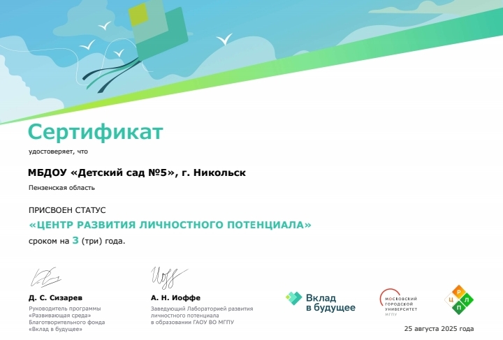 Наш детский сад получил статус «Центр развития личностного потенциала»!!!